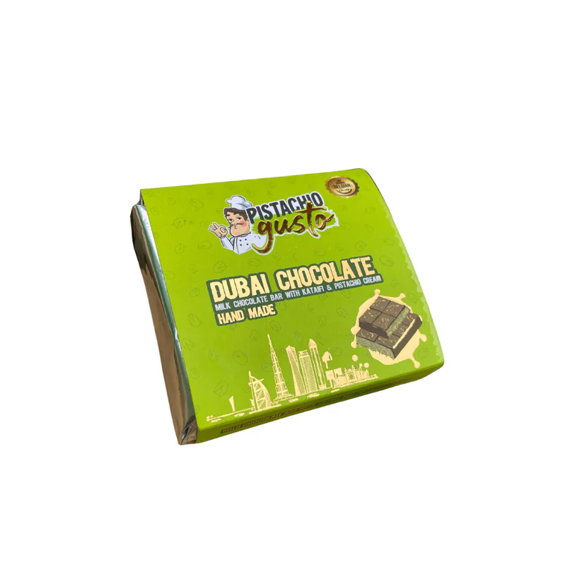 Say hello to the chocolate bar that’s gone viral — the Pistachio Gusto Dubai Chocolate is a rich, indulgent treat that’s breaking the internet. This 100g bar is loaded with silky, premium chocolate and filled with a luscious pistachio cream center that melts in your mouth. Every bite delivers the perfect balance of smooth, nutty, and sweet — it’s a must-try for chocolate lovers and pistachio fans alike. One bar is never enough… trust the hype.